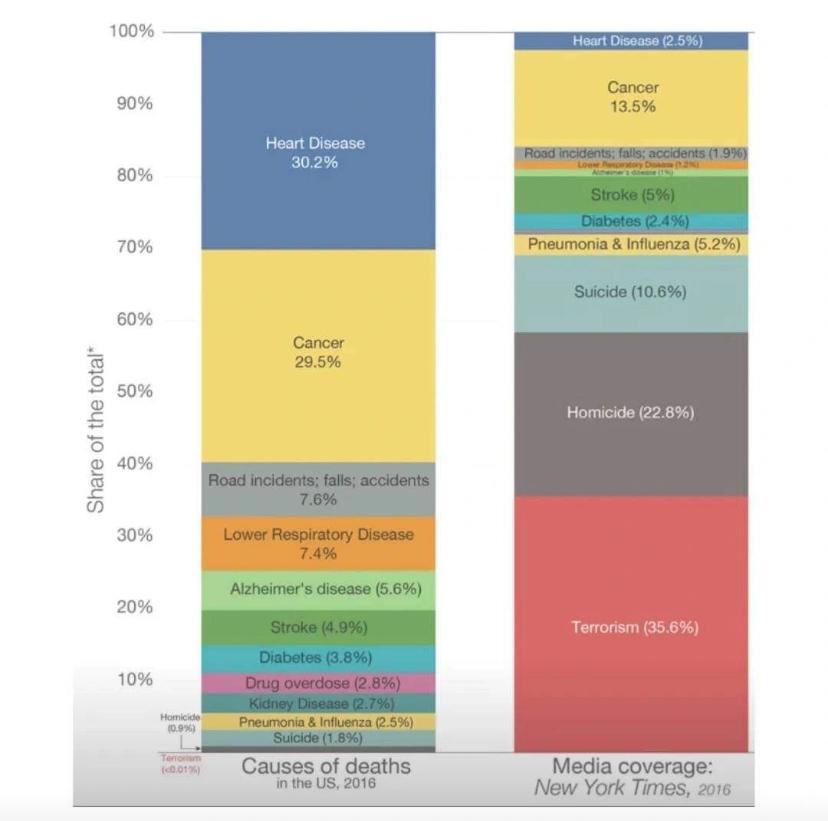 Este gráfico é sobre do que as pessoas morrem, o que as pessoas buscam e o que a mídia cobre. Dê uma olhada nele.